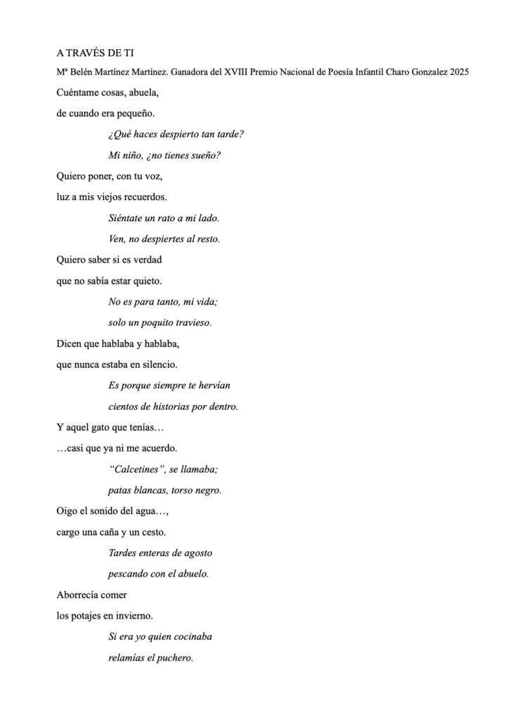 El poema ganador A través de ti presenta la estructura dialogada abuela/nieto como excusa para hacer notar la relación entrañable entre ellos, con verso romance, octosílabo y por ello con rima asonante en los pares, con buen ritmo, lograda musicalidad e imágenes muy conseguidas, cerrando con un precioso final por bello e inesperado en el que se revela la condición de invidente del niño, y que culmina con los preciosos y emotivos versos (llevas el alma en la punta de los dedos).
