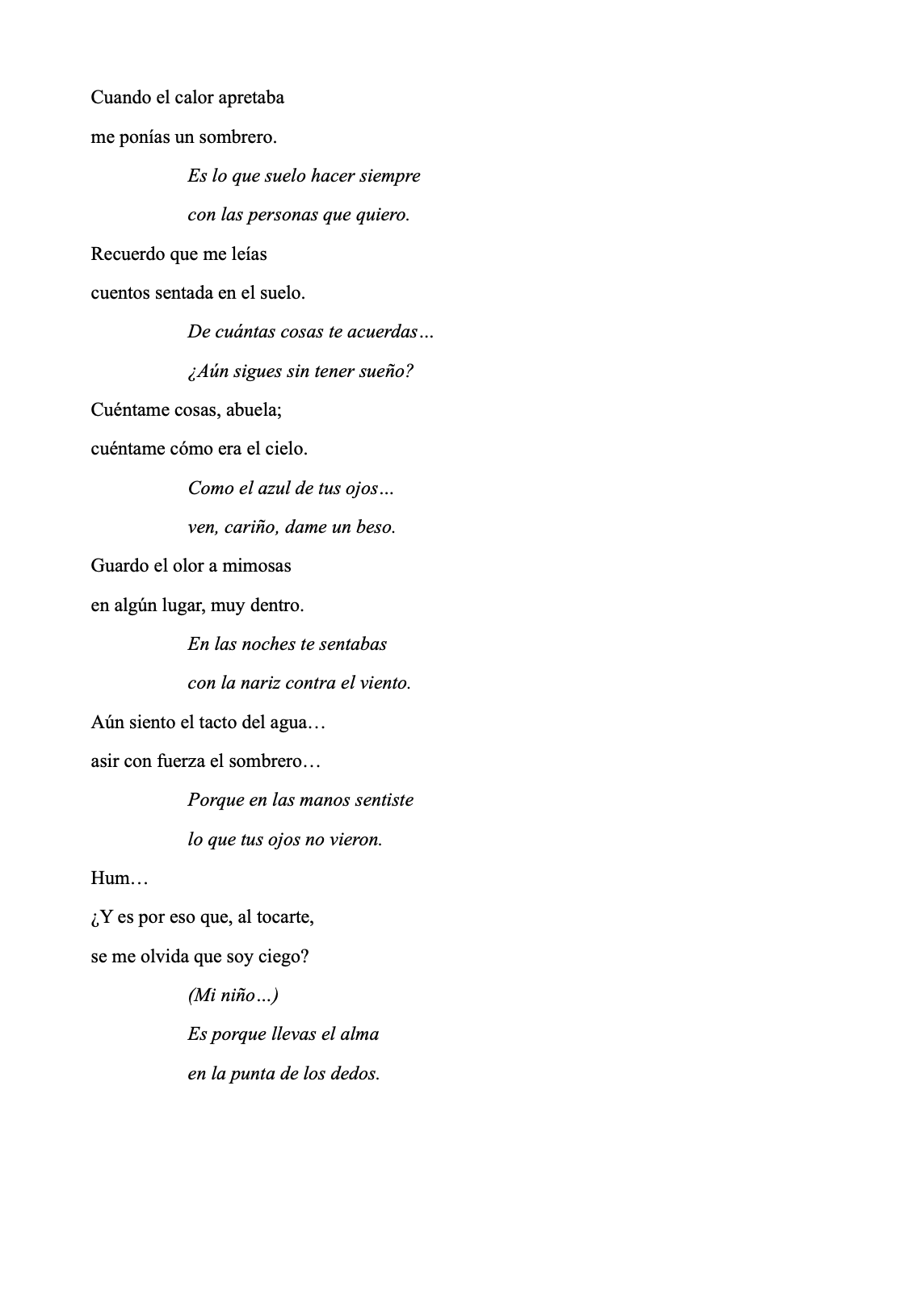 Es un precioso y emotivo texto que rememora recuerdos mediante el tacto, los olores y el gusto y los sonidos, dado que carece del otro sentido, el de la vista, y lo hace con la ayuda de la abuela que le compone con palabras las imágenes que él no puede ver.