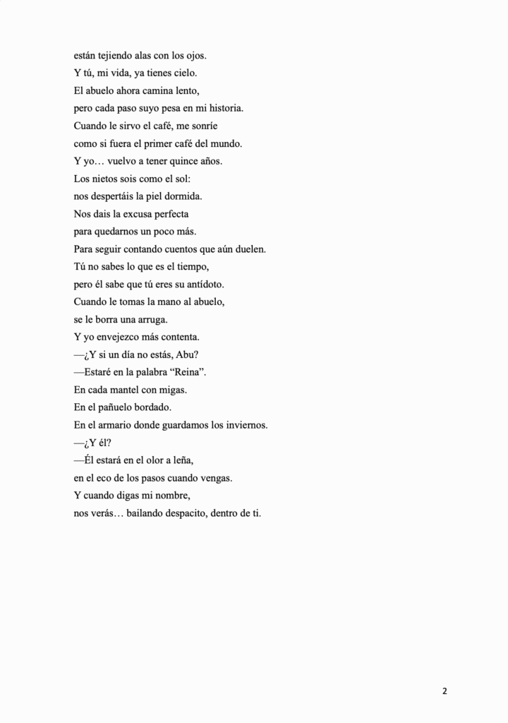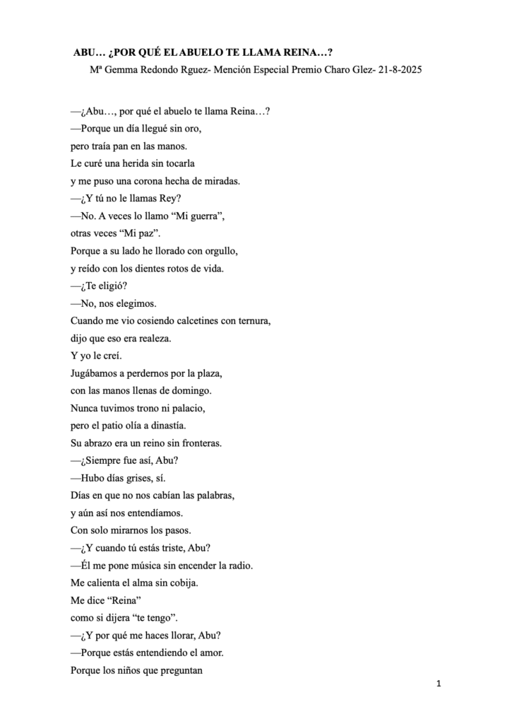 El poema Abu… ¿Por qué abuelo te llama reina…?, galardonado con Mención Especial, es un magnífico poema emotivo y literario. Utiliza también en su estructura el diálogo abuela/o nieto/a, y nos cuenta en verso libre y sin ataduras métricas, no sólo la larga historia de amor de los abuelos, sino también lo que es el amor verdadero en sí, con sus desafíos, sus momentos difíciles, y su recompensa final.